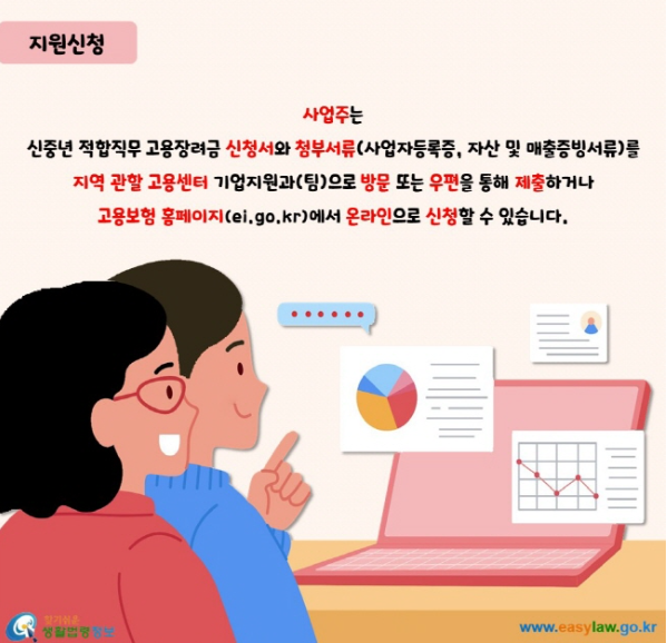 신중년 적합직무 고용장려금은 고령자와 준고령자의 경제적 참여를 장려하고 고용 기회를 확대하기 위해 제공되는 프로그램으로, 신중년 적합직무에 고용하는 사업주에게 근로자 임금의 일부를 지원하여 일자리 창출과 고령 인력의 경제적 활동을 지원합니다. 예산이 소진되면 고용장려금 신청이 마감되오니 서둘러 신청하시길 바랍니다.