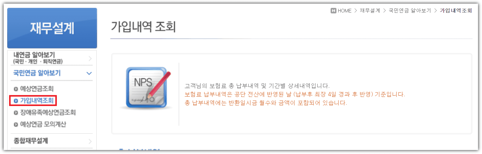 3. 예상수령액 조회 화면에서 좌측에 있는 <가입내역조회>를 클릭합니다.