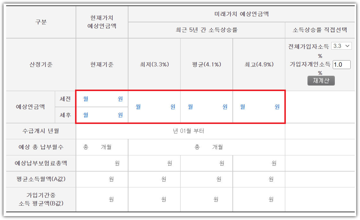 7. 현재기준과 미래가치의 예상연금액, 예상 납부월수, 예상납부보험료, 평균소득월액 등을 확인할 수 있습니다.
