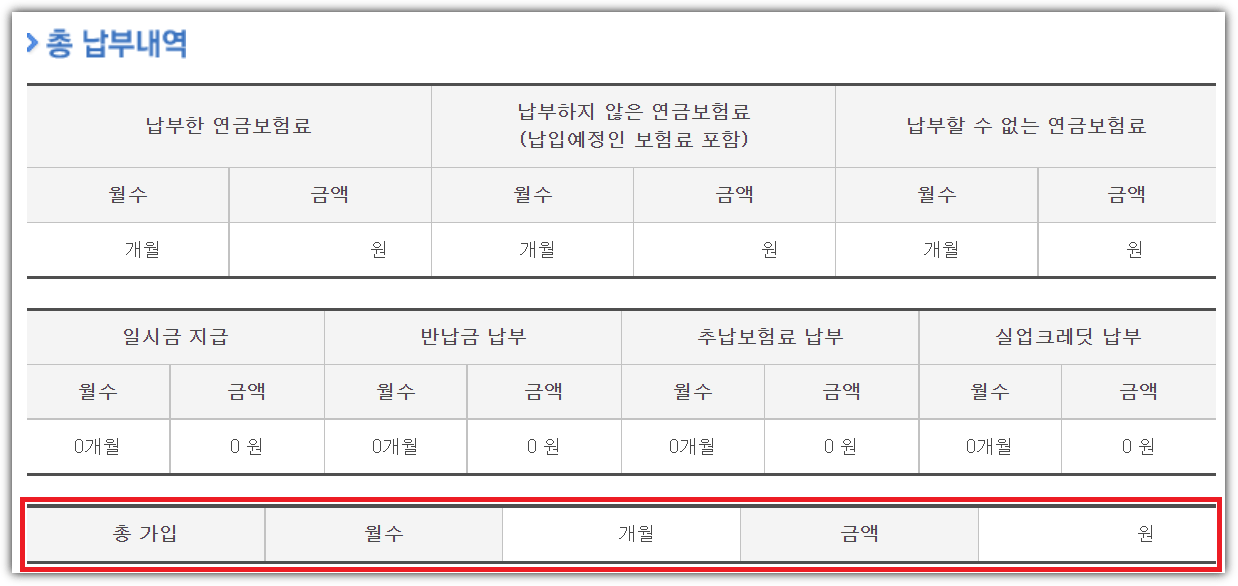 4. <총 가입>항목에서 국민연금 보험료를 납부한 기간과 금액을 확인할 수 있습니다.