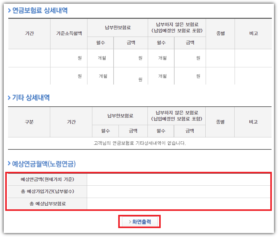 5. 추가로 "연금보험료 상세내역", "기타 상세내역", "예상연금월액" 등의 정보를 확인할 수 있습니다.